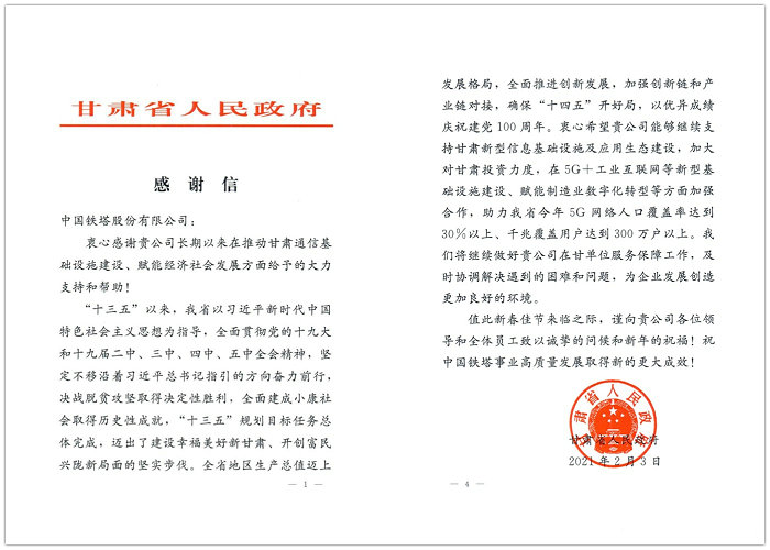 近日,甘肃省人民政府向中国铁塔股份有限公司(以下简称“中国铁塔”)发来感谢信,对中国铁塔长期以来在推动甘肃通信基础设施建设、赋能经济社会发展方面给予的大力支持和帮助表示感谢。
