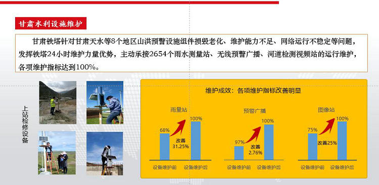 在甘肃,针对甘肃天水等8个地区山洪预警设施组件损毁老化、维护能力不足、网络运行不稳定等问题,铁塔公司依托属地维护能力优势,主动承接2654个雨水测量站、无线预警广播、河道检测视频站的运行维护,各项维护指标达到100%。