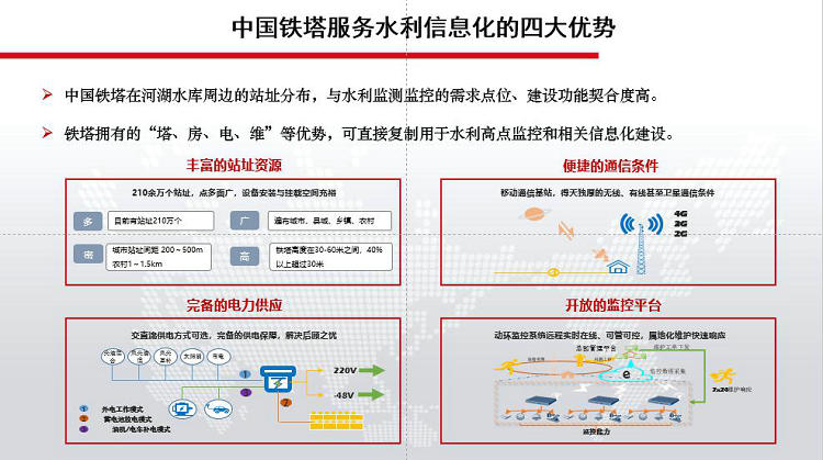 据悉,全国有水库近10万座,水利信息化技防最迫切的需求是在水库和水利流域周边有完备的通信覆盖、持续的电力保障、高点的视频监控及数据监测。中国铁塔在河湖水库周边的站址分布,与水利设施监测监控的需求点位、建设功能高度契合,中国铁塔的“塔、房、电、维”等优势,可直接复制用于水利高点监控和相关信息化建设,有效解决水利监控“高点难、引电难、维护难”等难题。