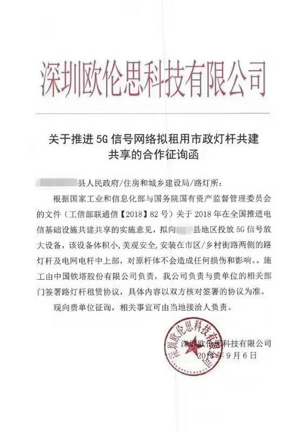 中国铁塔股份有限公司主营业务为铁塔建设、维护、运营;基站机房、电源、空调配套设施和室内分布系统的建设、维护、运营及基站设备的维护。现有某些公司或个人(以下简称“该等第三方”)以“深圳欧伦思科技有限公司”、“广东恒塔通信科技有限公司”、“广东讯联通信科技股份有限公司”等公司名义,以5G通信建设为由,假借我公司合作方身份开展洽谈租用市政公共设施或业主共用设施等经营活动,我公司现声明如下: